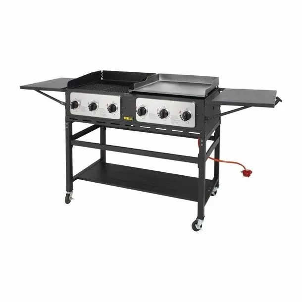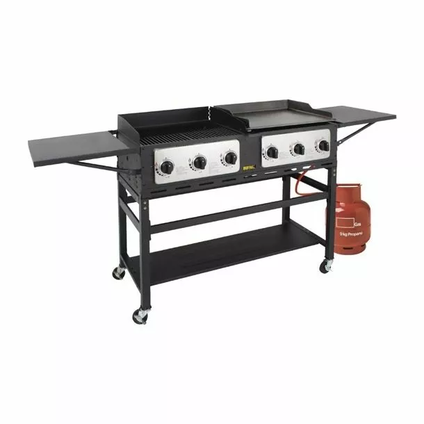Large, powerful and exceptionally versatile, the Buffalo propane barbecue grill and griddle combi allows you to serve large quantities of delicious BBQ food on the move. The left side is a three burner char grill, enabling the cooking of succulent burgers, steaks and skewers, whilst the right hand side features a large steel plate griddle, ideal for bacon, eggs, onions and other griddled food.