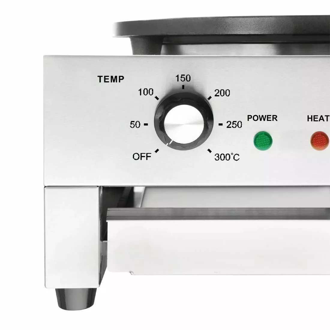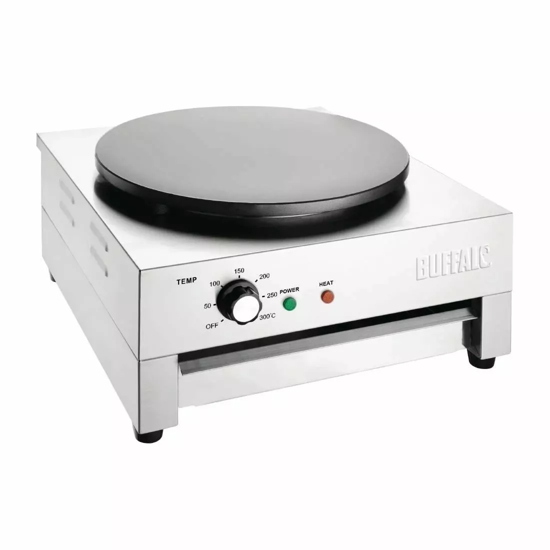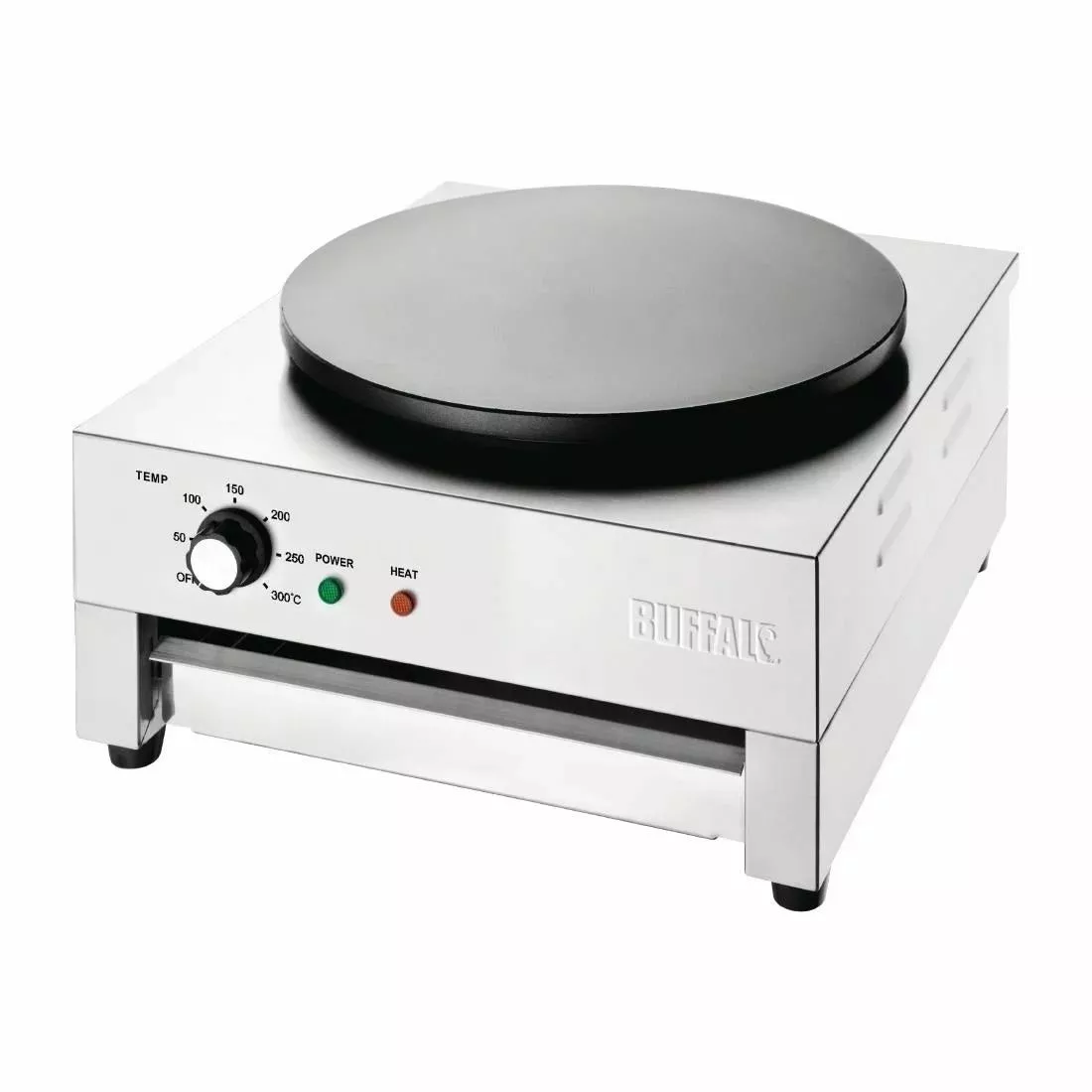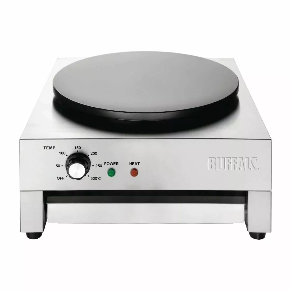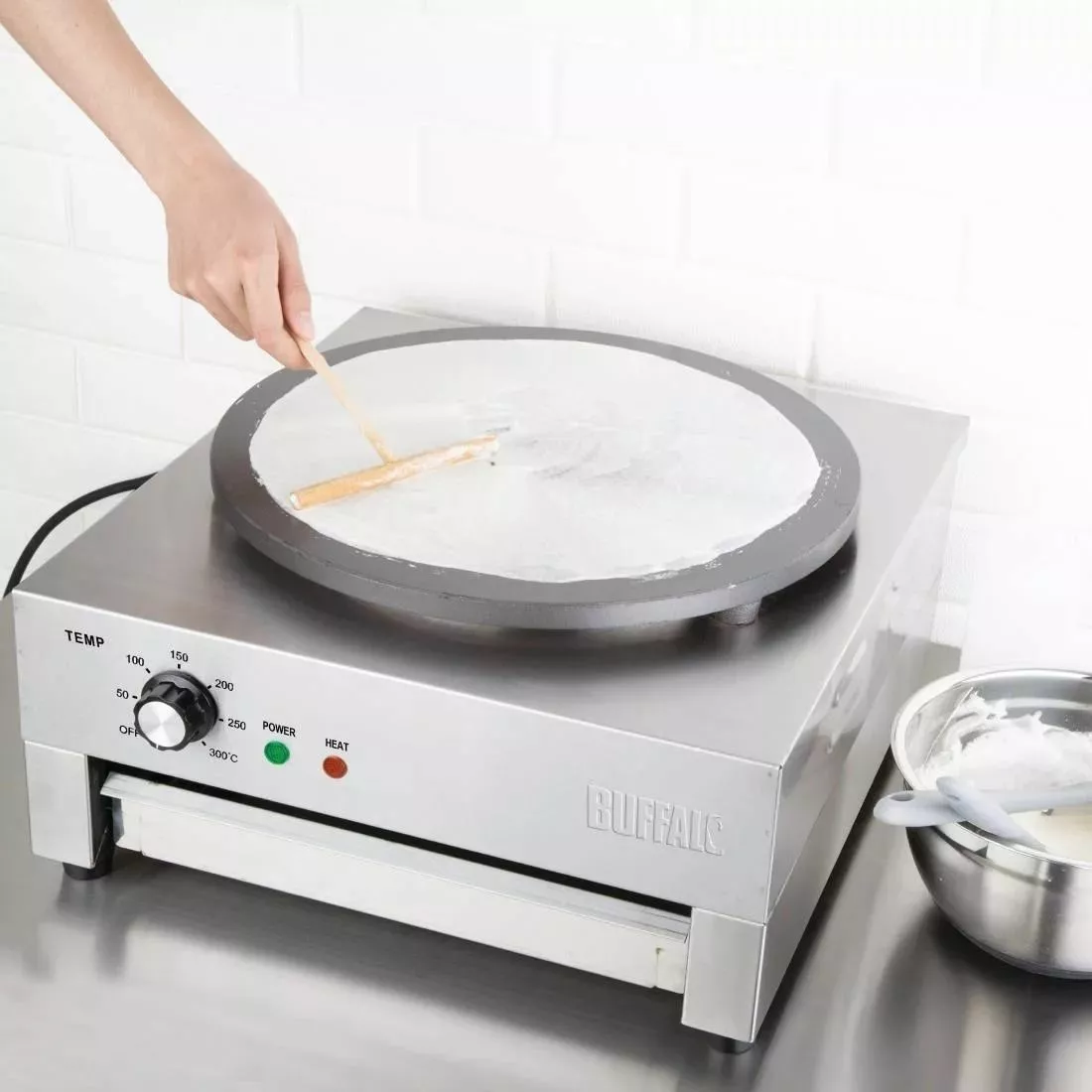 The Buffalo crepe maker is a fast and effective solution for making delicious traditional crepes and pancakes. With an efficient non-stick iron cooking plate and powerful wrap-around heating element, the crepe maker is ready to cook in minutes – meaning you can turn around orders quickly. Operation couldn’t be easier – with simple plug-and-play power and dial temperature control, the Buffalo makes it easy to produce great results.