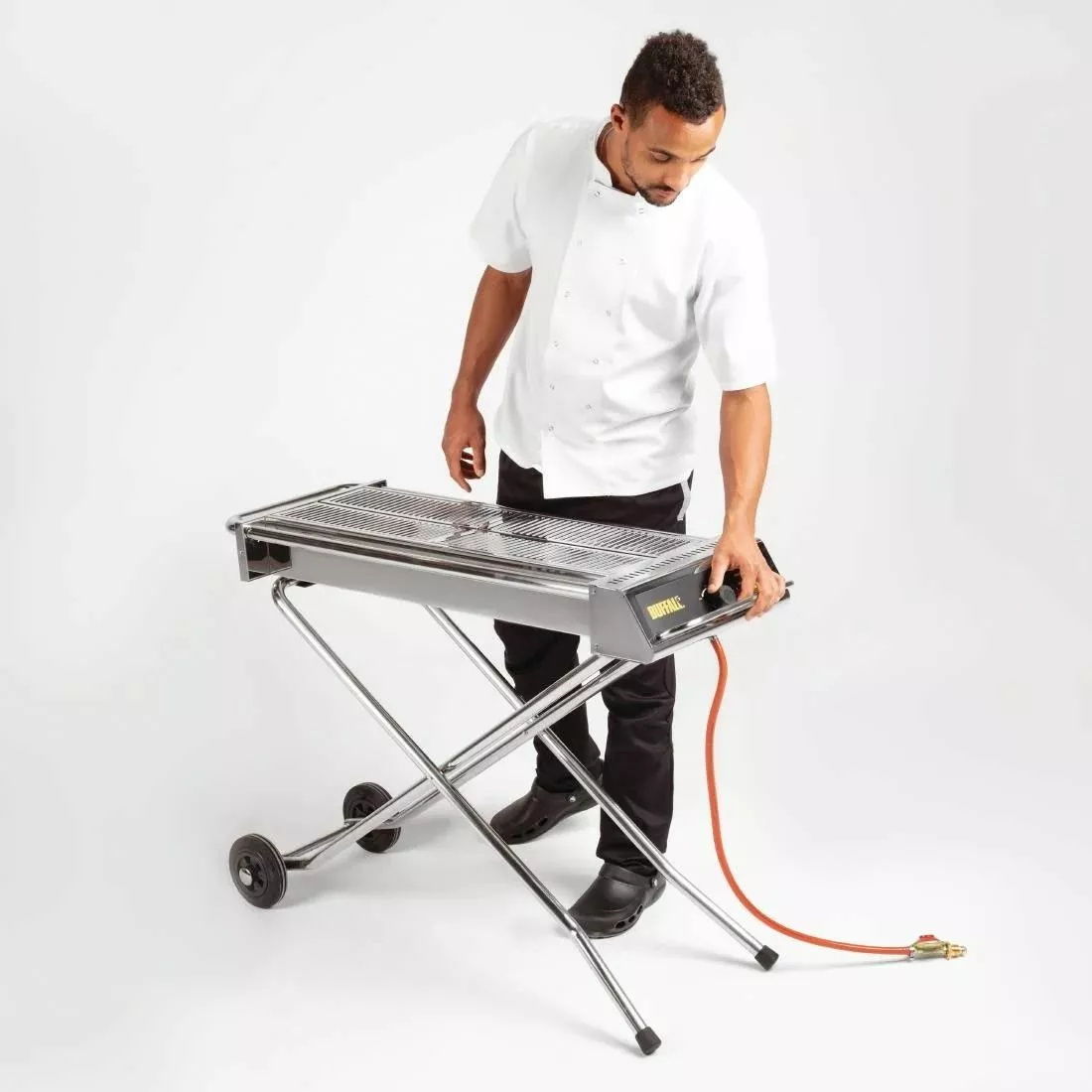 The high powered, heavy duty, convenient and portable Buffalo gas barbecue is perfect for all outdoor catering occasions. Constructed with two fitted wheels for greater manoeuvrability and with a high quality stainless steel frame and chrome finish, this BBQ is renowned for providing a uniquely reliable and highly reliable service. It’s also supplied with attachments to fit propane gas bottles and fit clip-on side tables that are available separately for added versatility. An ideal festival barbecue, as well as all sorts of other mobile catering such as fÍ_tes, carnivals and outdoor exhibitions.