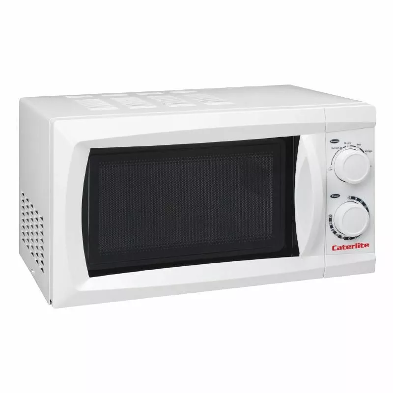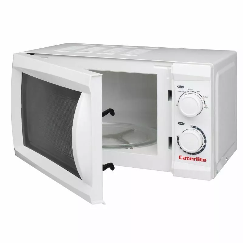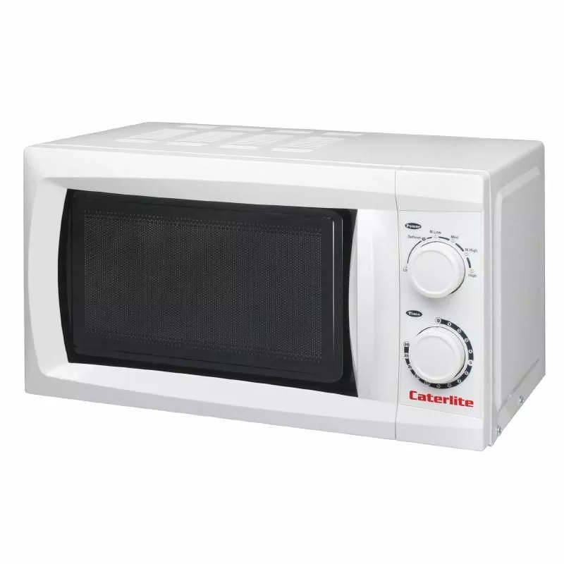 Cook, reheat or defrost food quickly and easily with the compact Caterlite 700W microwave oven. With simple manual dial controls, you can easily select one of six power settings and time up to 30 minutes. The rotating glass turntable ensures a consistent cook throughout the food and once you’ve finished, the stylish white steel interior and exterior is effortless to clean. A great light duty microwave ideal for home or light duty use.