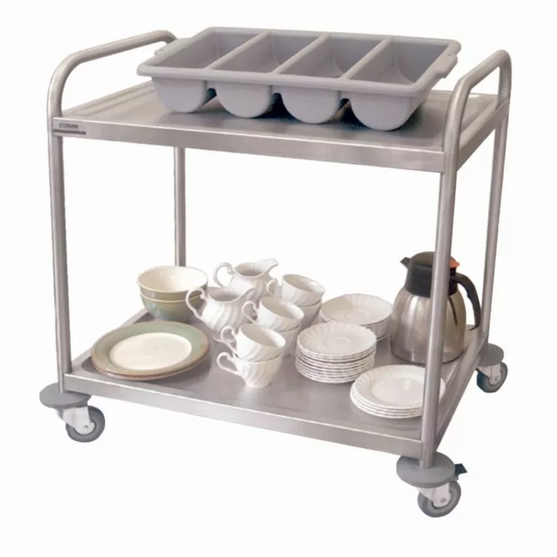 High quality stainless steel serving trolley with two shelves. Supplied with two braked wheels and sound deadening pads. Non removable dished trays come as standard. Tray size: 751 x 501mm.