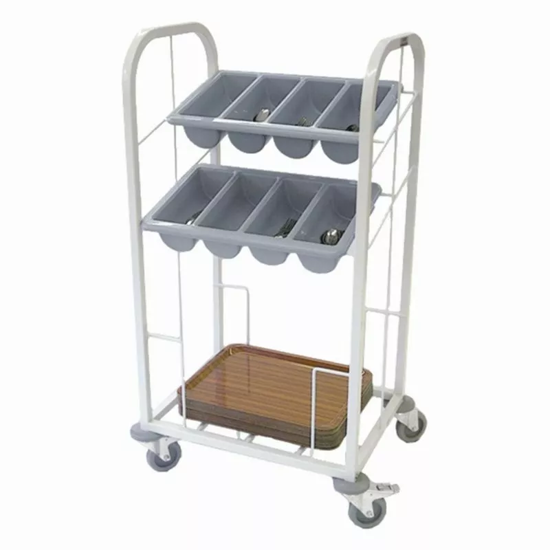 Trolleys for dispensing cutlery, able to hold up to 100 trays. Fully welded. Easily accessible height for cutlery bin(s).