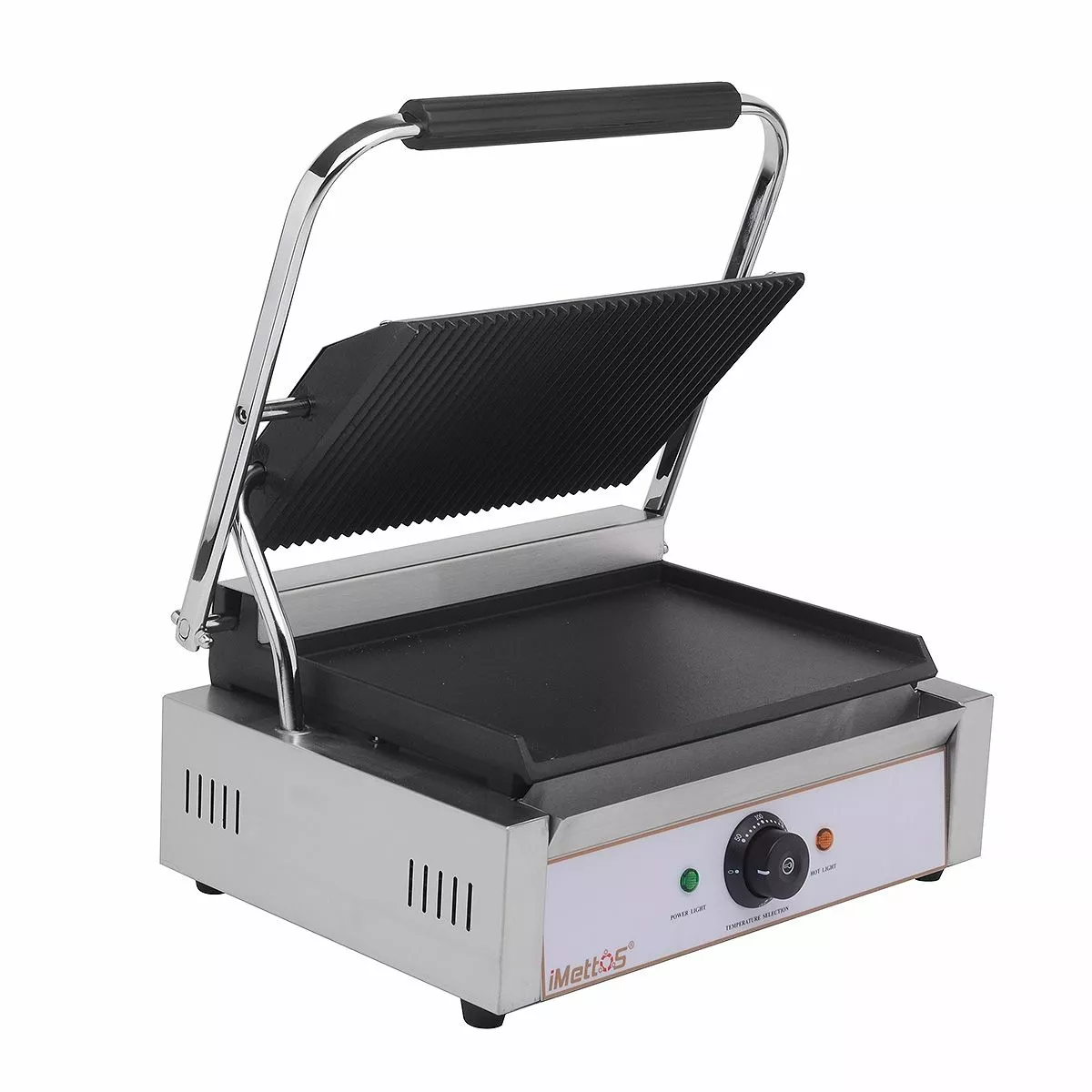 The iMettos Contact Grill is a great value Bistro Contact Grill which combines a tough stainless steel construction with ribbed cast iron plates for long-term use and healthier grilling and is ideal for cooking burgers, steaks, paninis and toasted sandwiches in busy establishments. With an adjustable swivel head and a variable heat knob for different thicknesses and temperatures, you have complete control over the entire grilling process. It is also supplied with a removable grease tray and griddle scraper for easier cleaning.