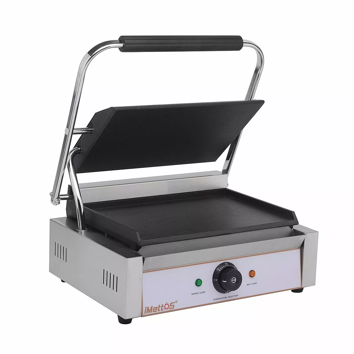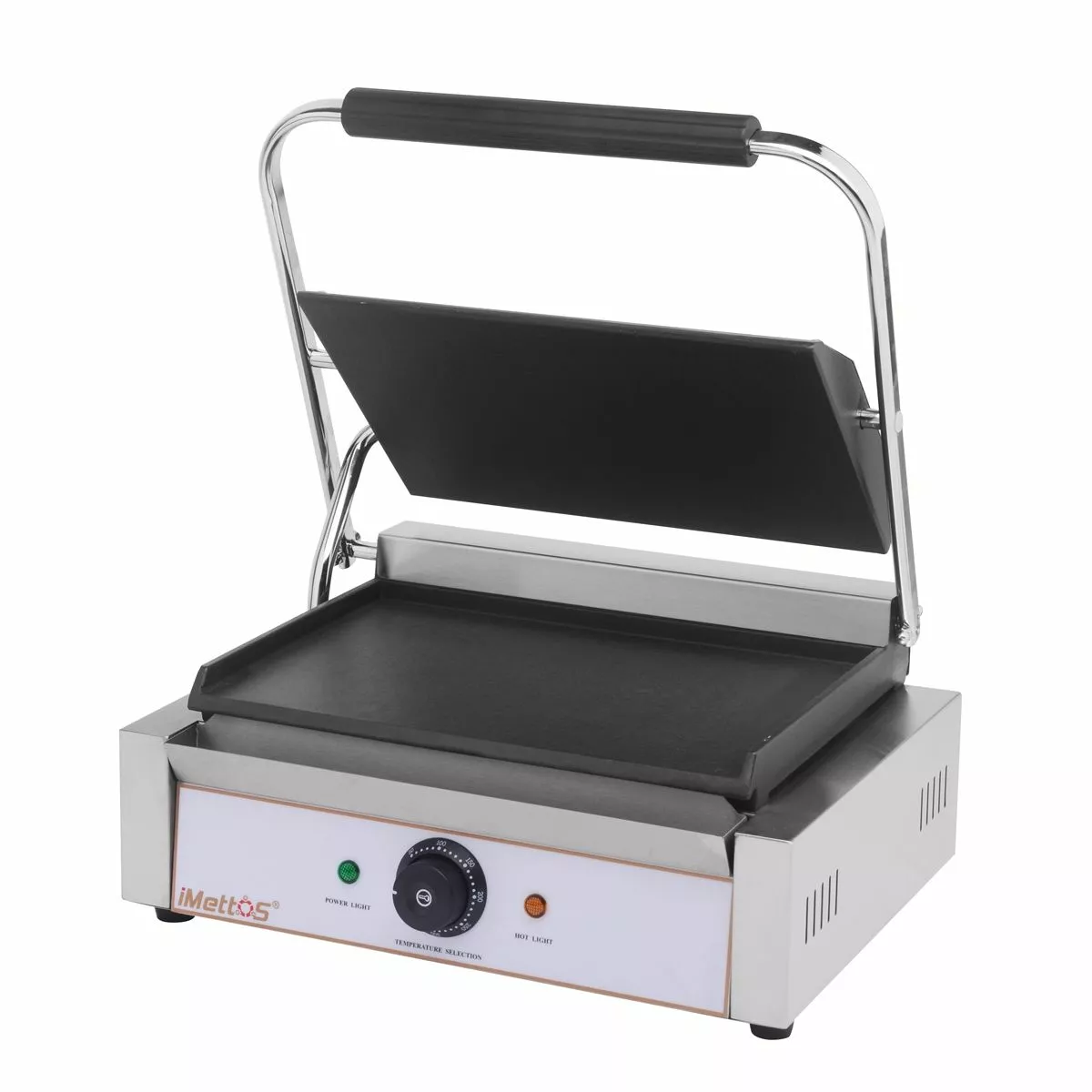 The iMettos Contact Grill is a great value Bistro Contact Grill which combines a tough stainless steel construction with ribbed cast iron plates for long-term use and healthier grilling and is ideal for cooking burgers, steaks, paninis and toasted sandwiches in busy establishments. With an adjustable swivel head and a variable heat knob for different thicknesses and temperatures, you have complete control over the entire grilling process. It is also supplied with a removable grease tray and griddle scraper for easier cleaning.