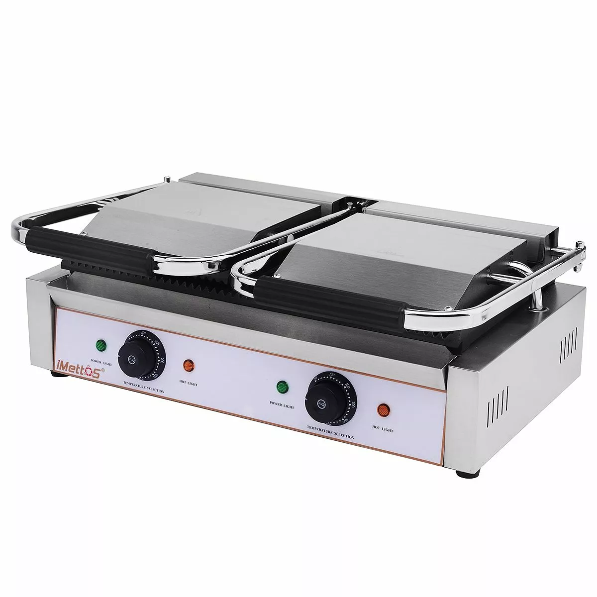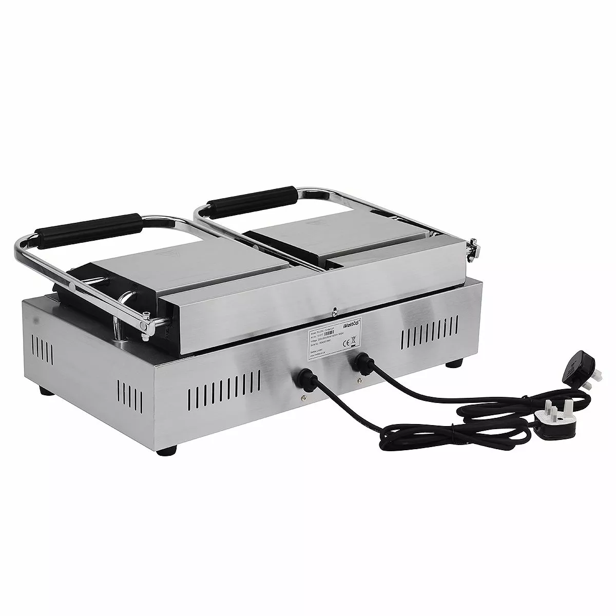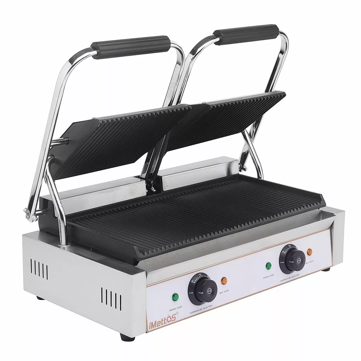 The iMettos Contact Grill is a great value Bistro Contact Grill which combines a tough stainless steel construction with ribbed cast iron plates for long-term use and healthier grilling and is ideal for cooking burgers, steaks, paninis and toasted sandwiches in busy establishments. With an adjustable swivel head and a variable heat knob for different thicknesses and temperatures, you have complete control over the entire grilling process. It is also supplied with a removable grease tray and griddle scraper for easier cleaning.
