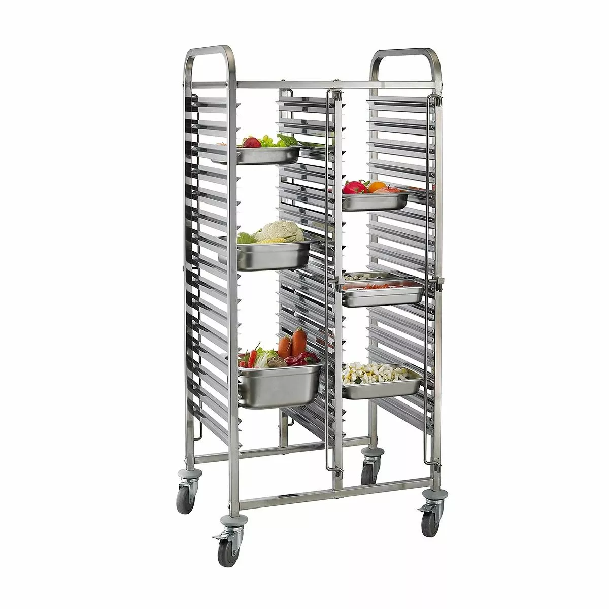 Made from a robust and durable stainless steel, this gastronorm racking trolley is perfect for daily use in busy commercial kitchens and food service areas. The trolley has 30 tiers, all sized to hold 1/1 sized gastronorm pans, making it an essential for restaurant kitchens. Large wheels with front brakes make it easy to transport pans from kitchen to storage room. This gastrnorm racking trolley is delivered flat packed for self assembly.