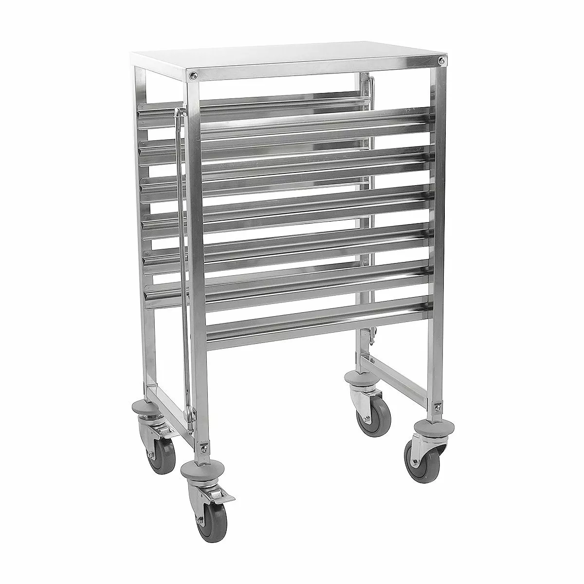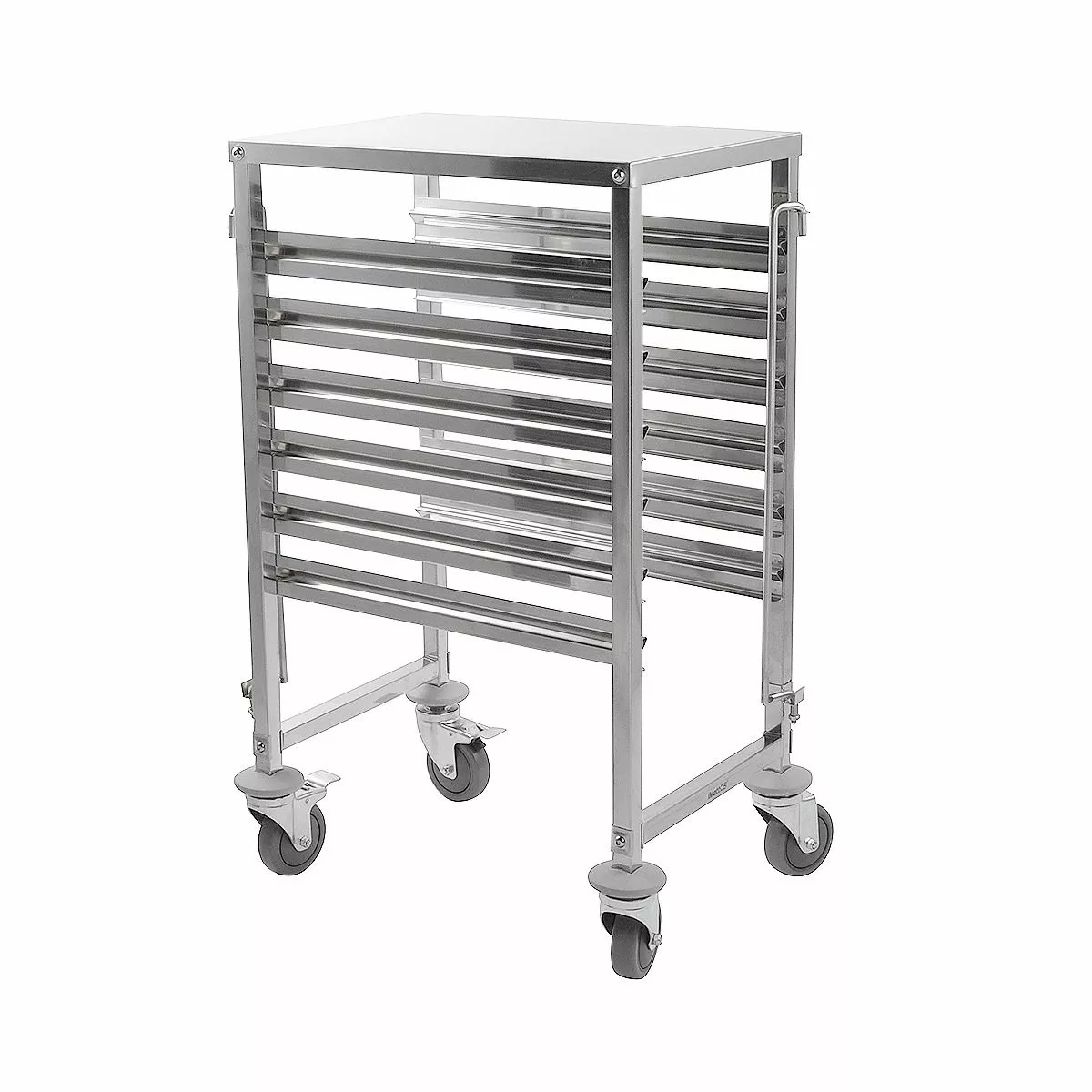 Made from a robust and durable stainless steel, this gastronorm racking trolley is perfect for daily use in busy commercial kitchens and food service areas. The trolley has 6 shelves, all sized to hold 1/1 sized gastronorm pans, making it an essential for restaurant kitchens. Large wheels with front brakes make it easy to transport pans from kitchen to storage room. This gastrnorm racking trolley is delivered flat packed for self assembly.