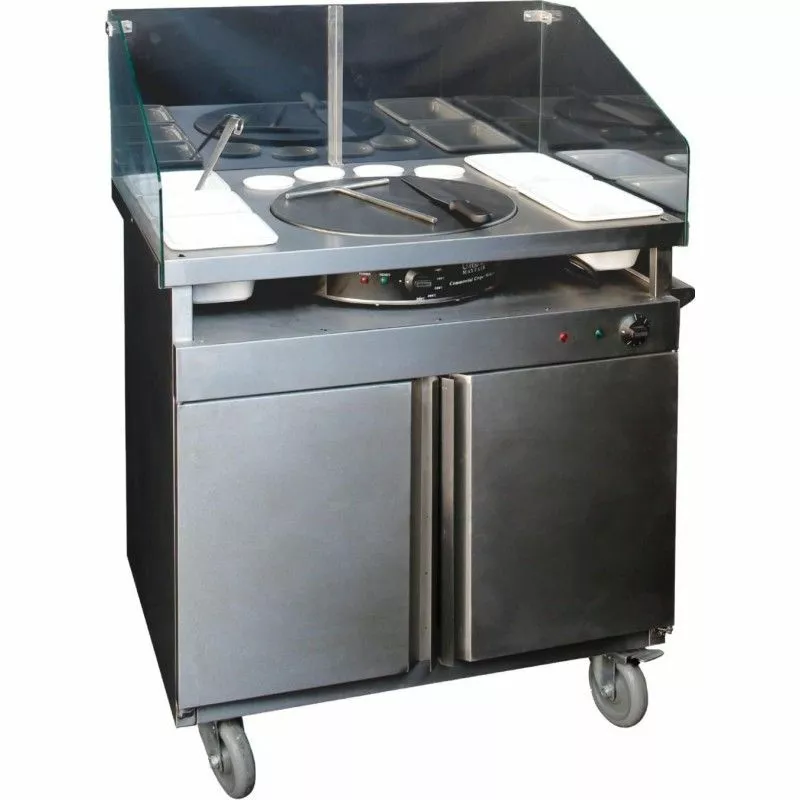 The FCS1 mobile crepe station features a electric crepe grill integrated into a mobile hotcupboard. The unit is provided with GN containers, ingredient bowls, spreader and spatula, everything you need to start selling crepes.