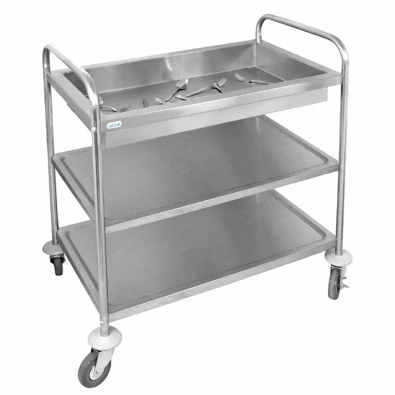 Cutlery trolley has a deep tray for collecting and transporting cutlery and other small catering items.